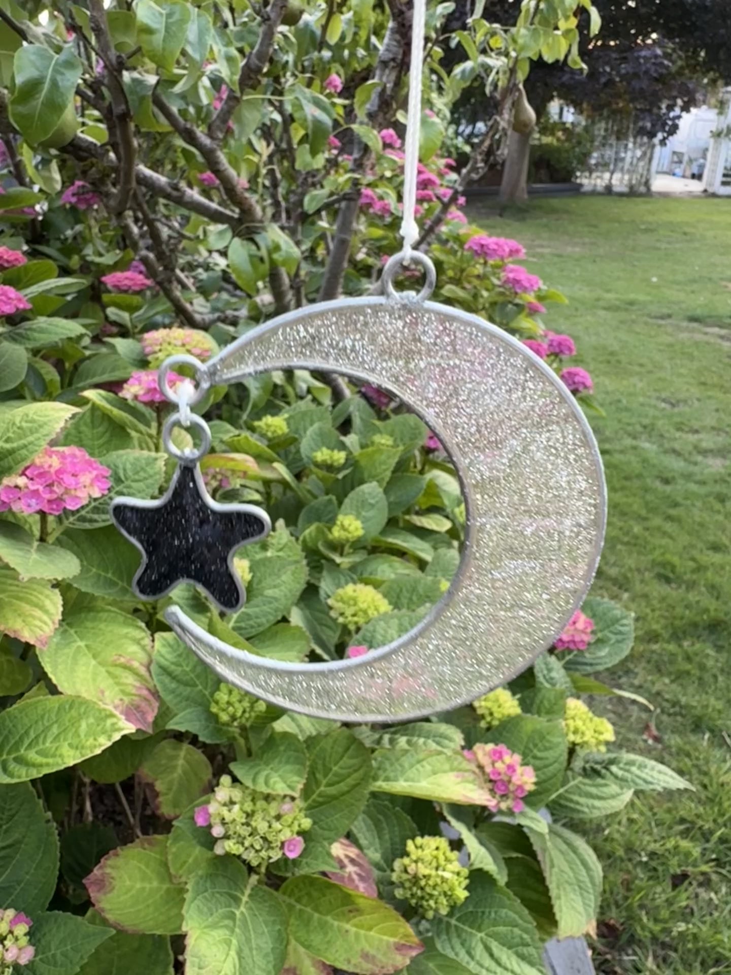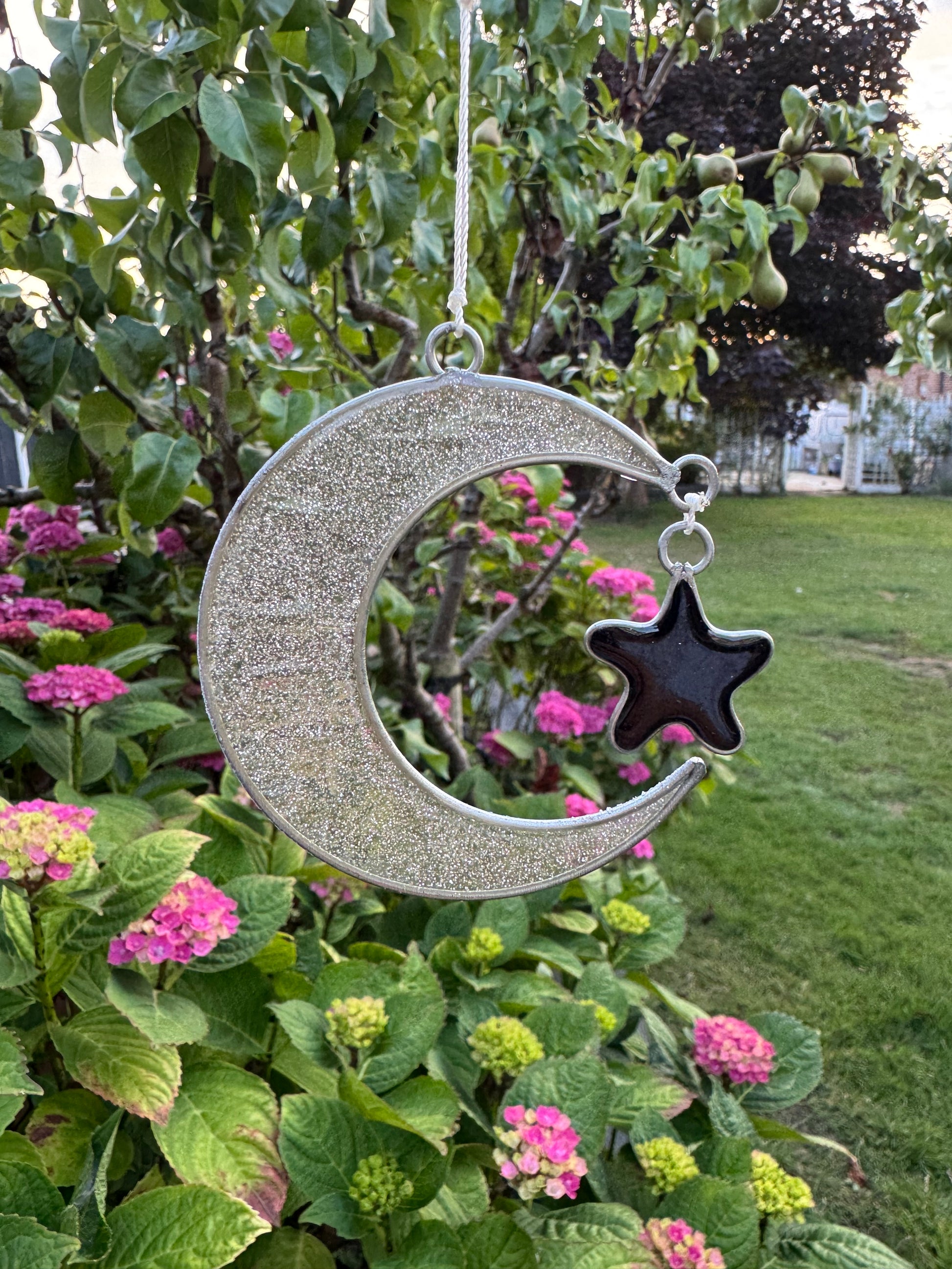 Add a touch of celestial charm to your space with this stunning Moon & Star resin suncatcher. Designed to catch and reflect sunlight beautifully, it sparkles with mystical elegance. Perfect for hanging in windows, gardens, or anywhere you want a little extra magic. A lovely accent for boho, spiritual, or nature-inspired decor.